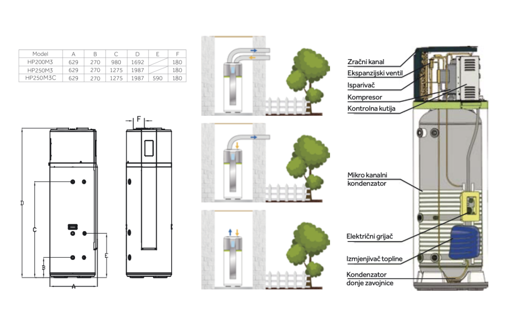 Dizalica topline sa spremnikom potrošne vode, kapaciteta do 240 litara. Idealno je rješenje za obiteljske kuće i apartmane. Dodatna pogodnost omogućava jednostavno prozračivanje objekta – uz korištenje zraka osiguravamo toplu sanitarnu vodu. Odvod ohlađenog zraka može se izvesti izvan prostora ili cijevima usmjeriti u prostor koji želimo ohladiti.