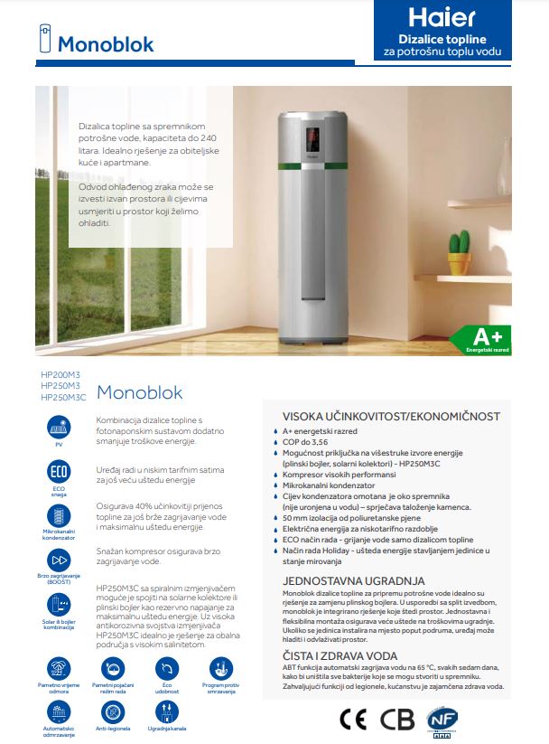 Model HP250M3C monoblok ima spiralni izmjenjivač te se može spojiti na solarne ili plinske bojlere kao rezervno napajanje za maksimalnu uštedu energije.