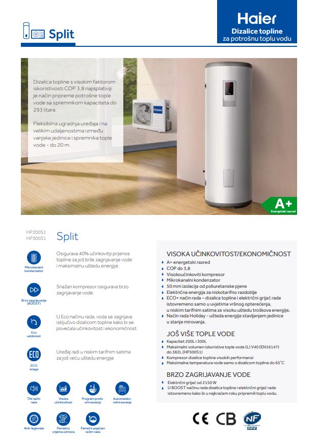 Dizalice topline split s integriranim spremnikom za potrošnu toplu vodu pružaju energetski učinkovito, ekonomično i ekološki prihvatljivo rješenje za zagrijavanje vode u domovima i poslovnim prostorima. Dolaze u različitim kapacitetima i veličinama, što omogućuje prilagodbu sustava vašim specifičnim potrebama i veličini doma. Kontrola temperature vode i vremena zagrijavanja može se jednostavno prilagoditi putem korisničkog sučelja, omogućujući vam da uživate u optimalnoj toplini vode prema vašim željama. Zahvaljujući visokoj energetskoj učinkovitosti, mogu značajno smanjiti troškove vaših računa za energiju tijekom dugog vremenskog razdoblja. Osim grijanja potrošne tople vode, mogu se koristiti i za grijanje prostora, pružajući višestruku funkcionalnost u jednom uređaju.