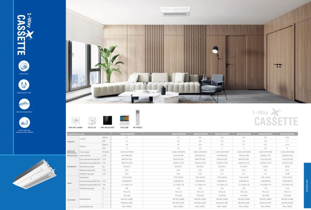 Jednosmjerna kazeta MRV slim dizajna idealno je rješenje za instalaciju u spuštene stropove i mjesta s ograničenim prostorom za montažu. Uz jednosmjerni ispuh zraka, jedinica je dizajnirana za maksimalnu pokrivenost klimatiziranog prostora gdje istrujavanje zraka doseže dno prostorije. Osigurava ugodnu mikroklimu u manjim prostorijama poput ureda, soba za sastanke, recepcija hotela, čekaonica i modernih stambenih prostora. Haier 1-smjerna kazetna jedinica kombinira se s vanjskom jedinicom VRF serije te osigurava visoku energetsku učinkovitost uz dotok svježeg zraka. Model je pogodan za hlađenje i grijanje prostora.