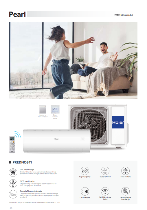 Haier Pearl elegantan model klima uređaja, prepoznatljiv po svojim zaobljenim linijama s mat bijelim završnim slojem na prednjem panelu. Pearl model nudi veću zaštitu vašeg zdravlja nego ikad prije pomoću najnovijih funkcija za pročišćavanje zraka. UVC lampa, 56°C sterilizacija i Coanda Plus Airflow inovacije su koje dolaze iz Haiera, a koje osiguravaju najvišu moguću kvalitetu zraka u klimatiziranom prostoru, bez virusa i štetnih čestica. S razinom buke od samo 18 dB (A) možete uživati u tihom radu uređaja tijekom dana i noći.