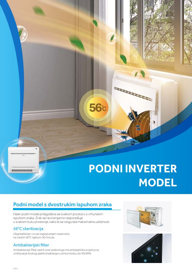 Podni modeli su diskretni i kompaktni, što ih čini savršenim rješenjem za prostore gdje je prostor ograničen. Njihov elegantan dizajn se lako integrira u bilo koju estetiku prostora. Haier podni model prilagođava se svakom prostoru s vrhunskim ispuhom zraka. Zrak se ravnomjerno raspoređuje u svakom kutu prostorije, kako bi se osigurala maksimalna udobnost.