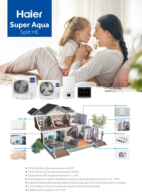 Haier dizalice topline Super Aqua split predstavljaju vrhunsko rješenje za potrebe grijanja, hlađenja i pripreme potrošne tople vode. Haier tehnologija osigurava visok stupanj učinkovitosti, prilagodljivost različitim vrstama objekata te savršeno funkcioniranje u sustavima s podnim grijanjem, ventilokonvektorima ili niskotemperaturnim radijatorima. Super Aqua split dizalice topline ističu se po svojoj svestranosti s više opcija ugradnje unutarnjih i vanjskih jedinica. Bez obzira na specifičnosti prostora, uređaji omogućuju optimalno prilagođavanje.